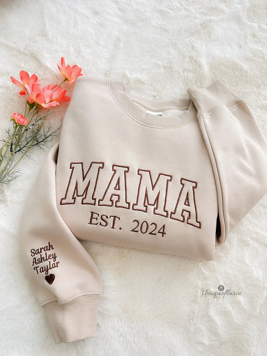 Custom Embroidered Mama Sweatshirt/Hoodie with Kids Names on Sleeve Mother's Day Gift