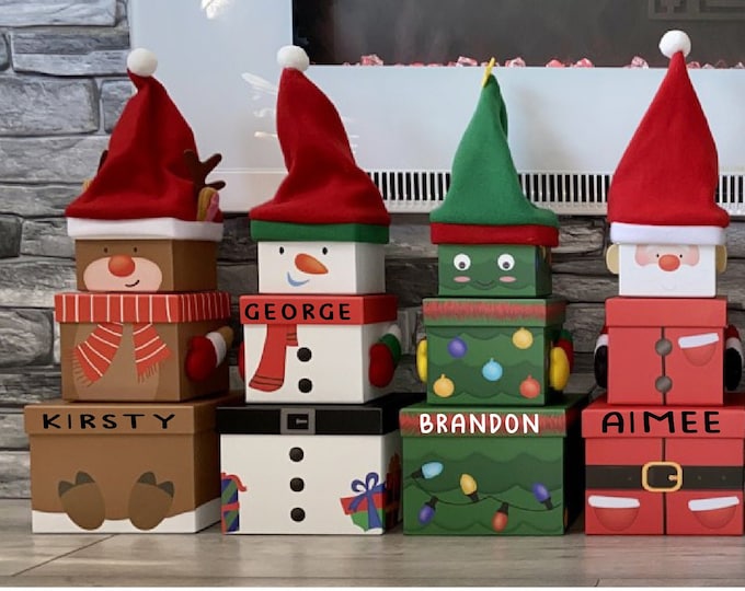 Personalised Christmas stacking boxes, 3 piece set(Christmas hats not included). Perfect for a Christmas eve box, or for treats and goodies on Christmas Day.