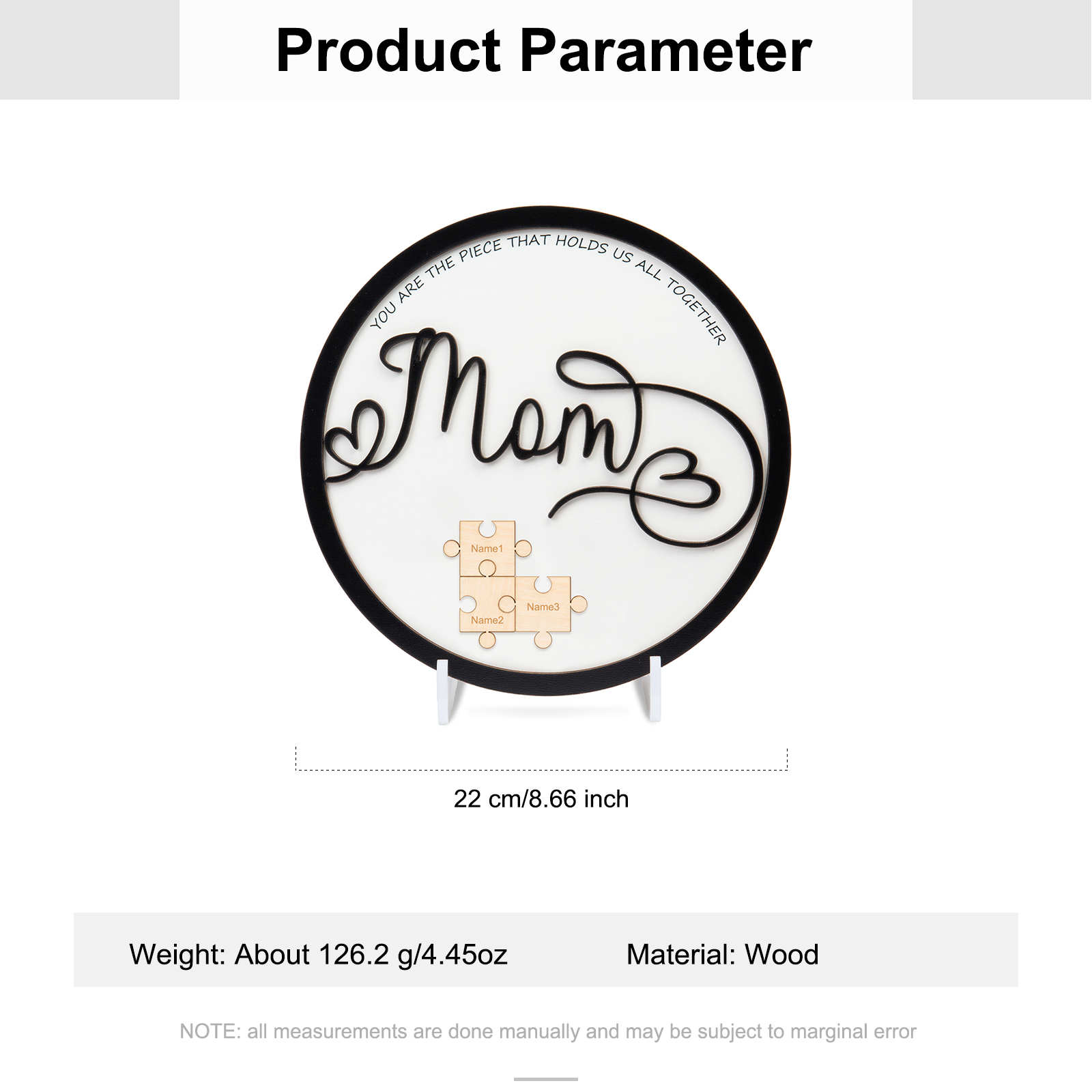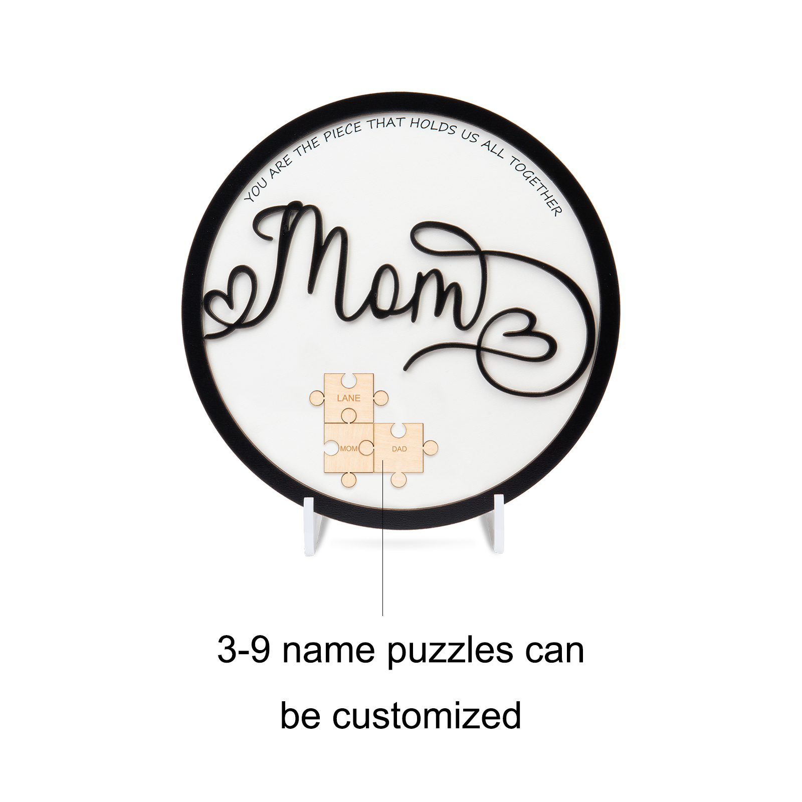 Inspiration: Features sentiment that reads “You Are the Piece That Holds Us All Together”; Rustic finish and creative accents paired with the sentiment of hope and inspiration. The mom font is super unique and romantic.