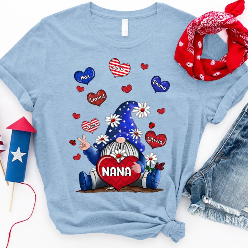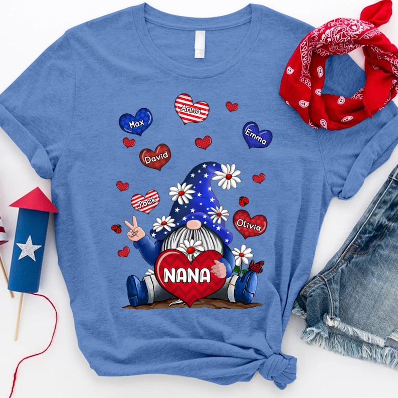 Personalized Grandma Shirt, Custom Grandma Gnomes with grandchild names, Grandma 4th of july Shirt Patriotic Gnomes Pattern Version Tshirt