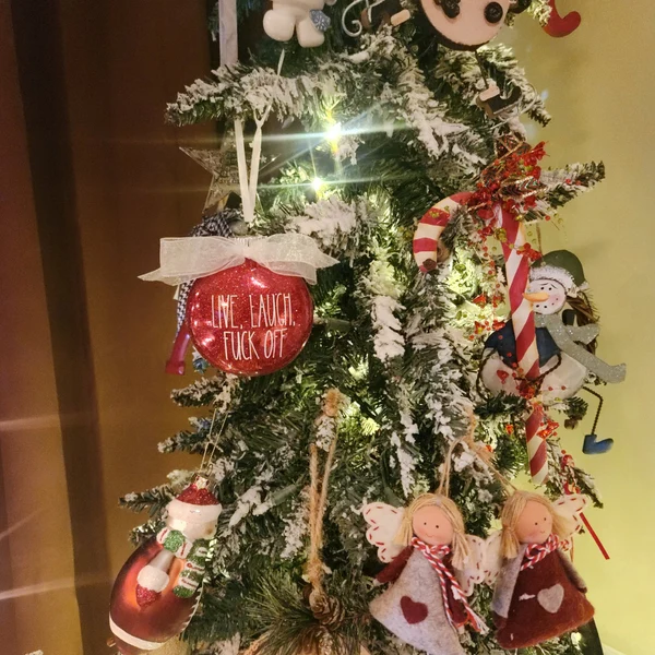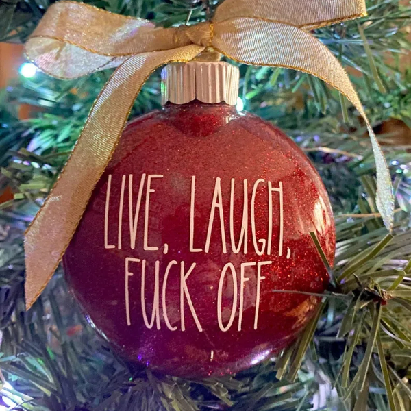🎄This listing for a handmade custom personalized "Live, Laugh, Fuck Off" plastic disc ornament. A hilarious holiday gift for someone who loves sassy decor🎄