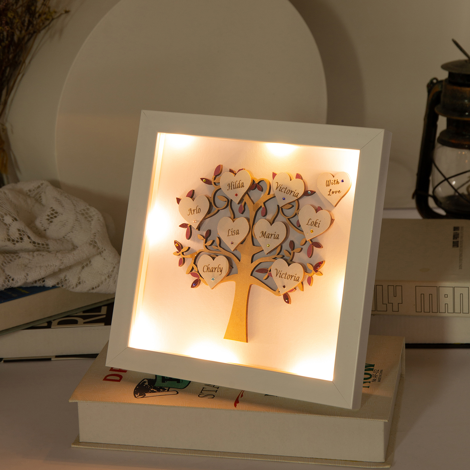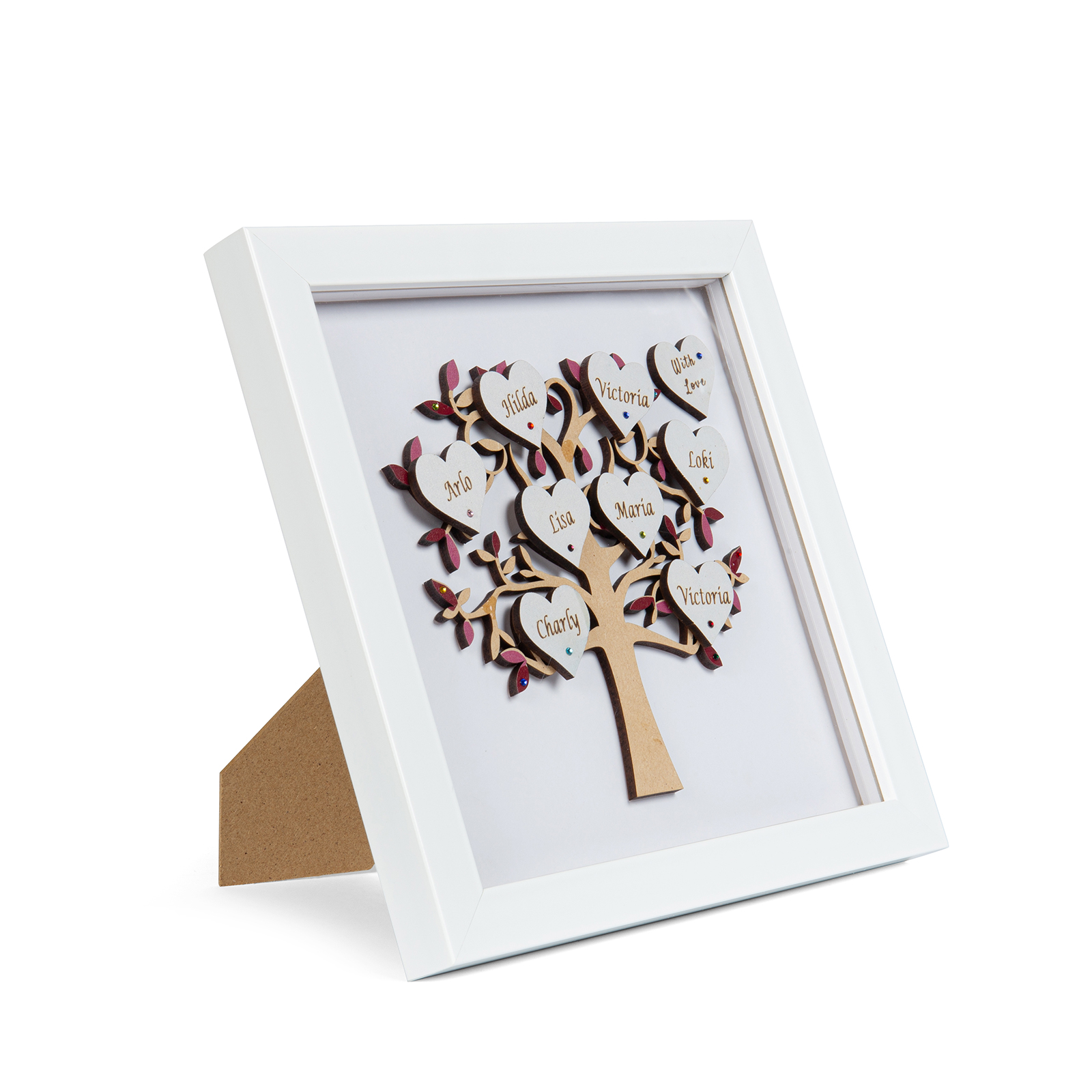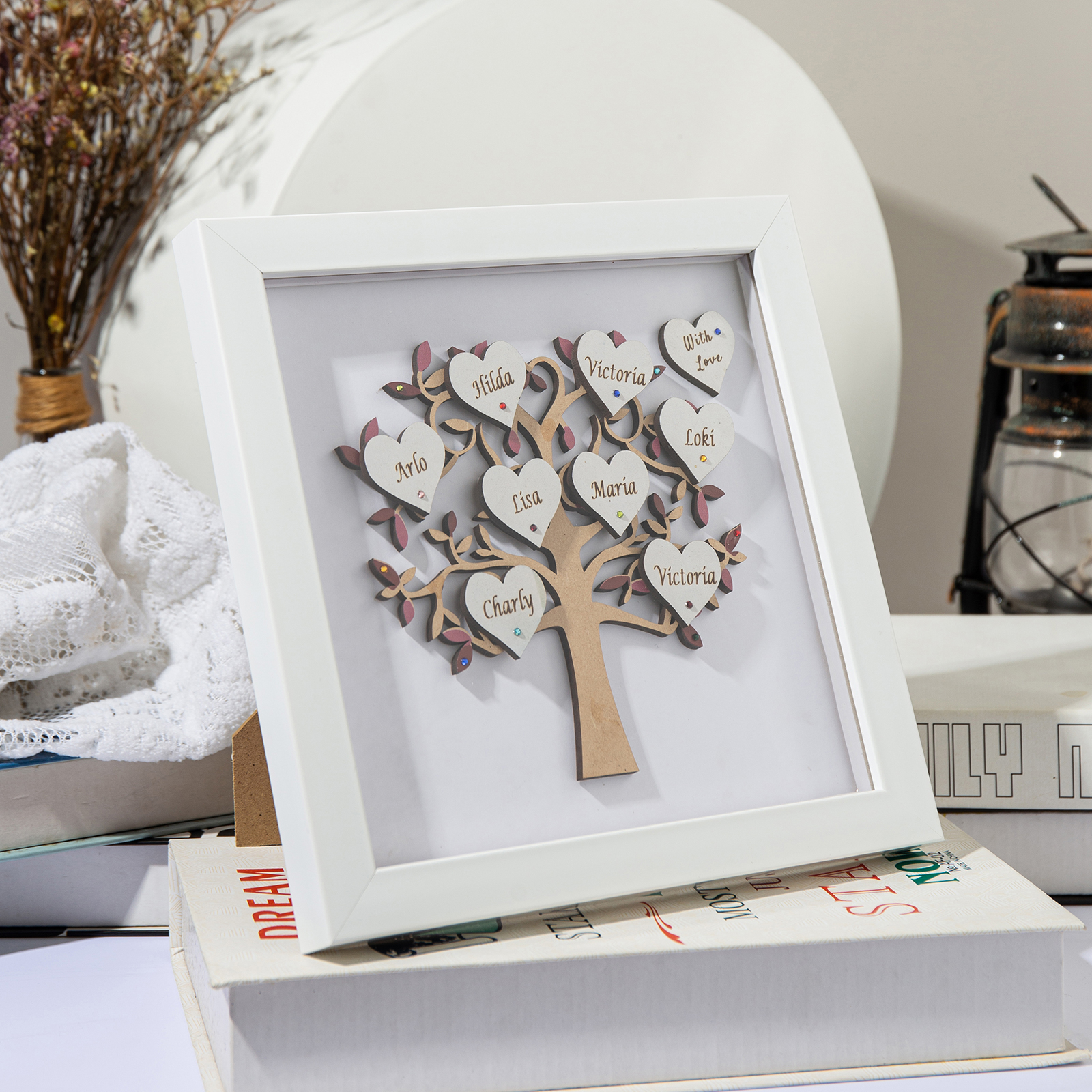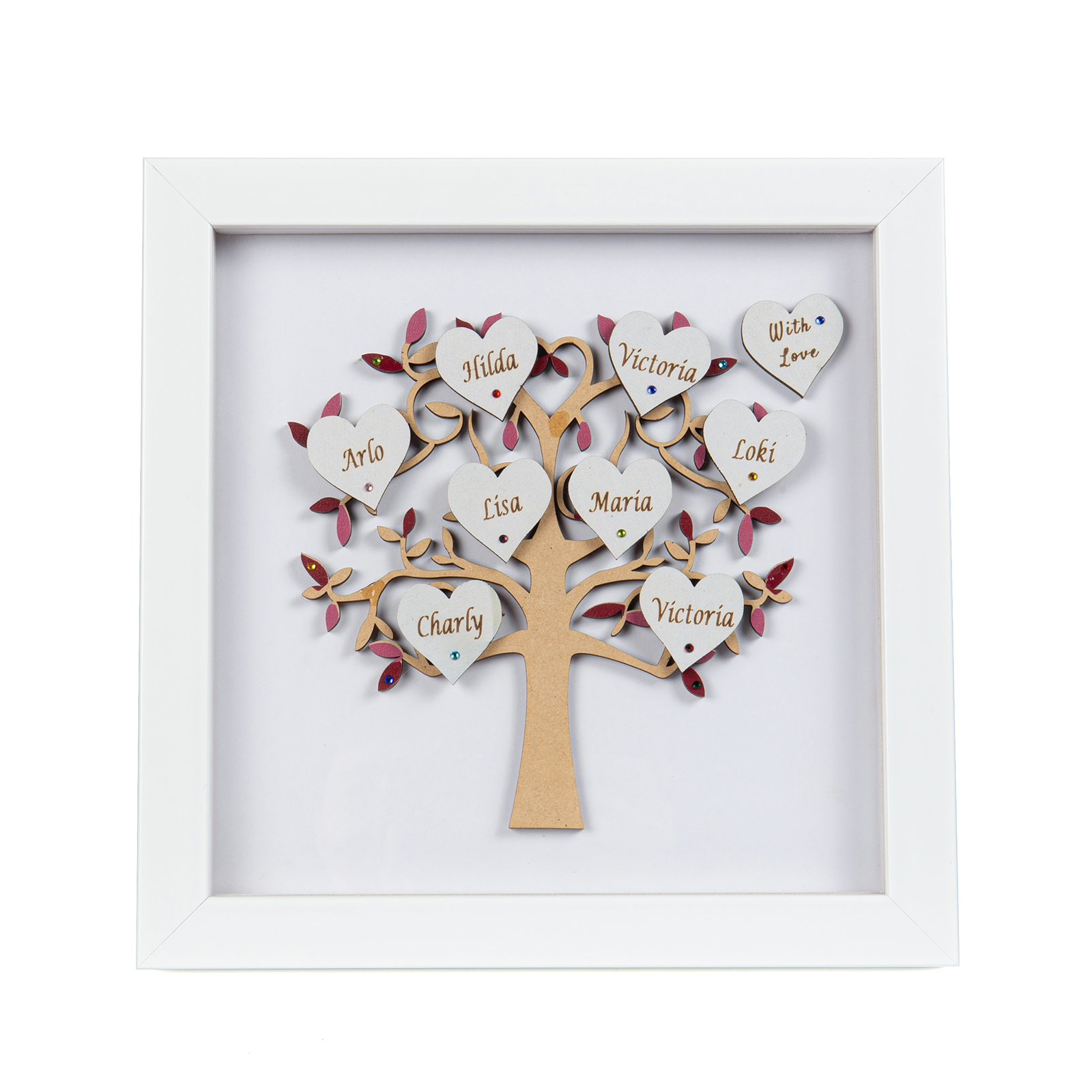 ✨Our beautiful family tree frame is made into a lovely personalized gift with personalized heart and gems. Paint is painted all around, adding a special touch and elegance to the frame.